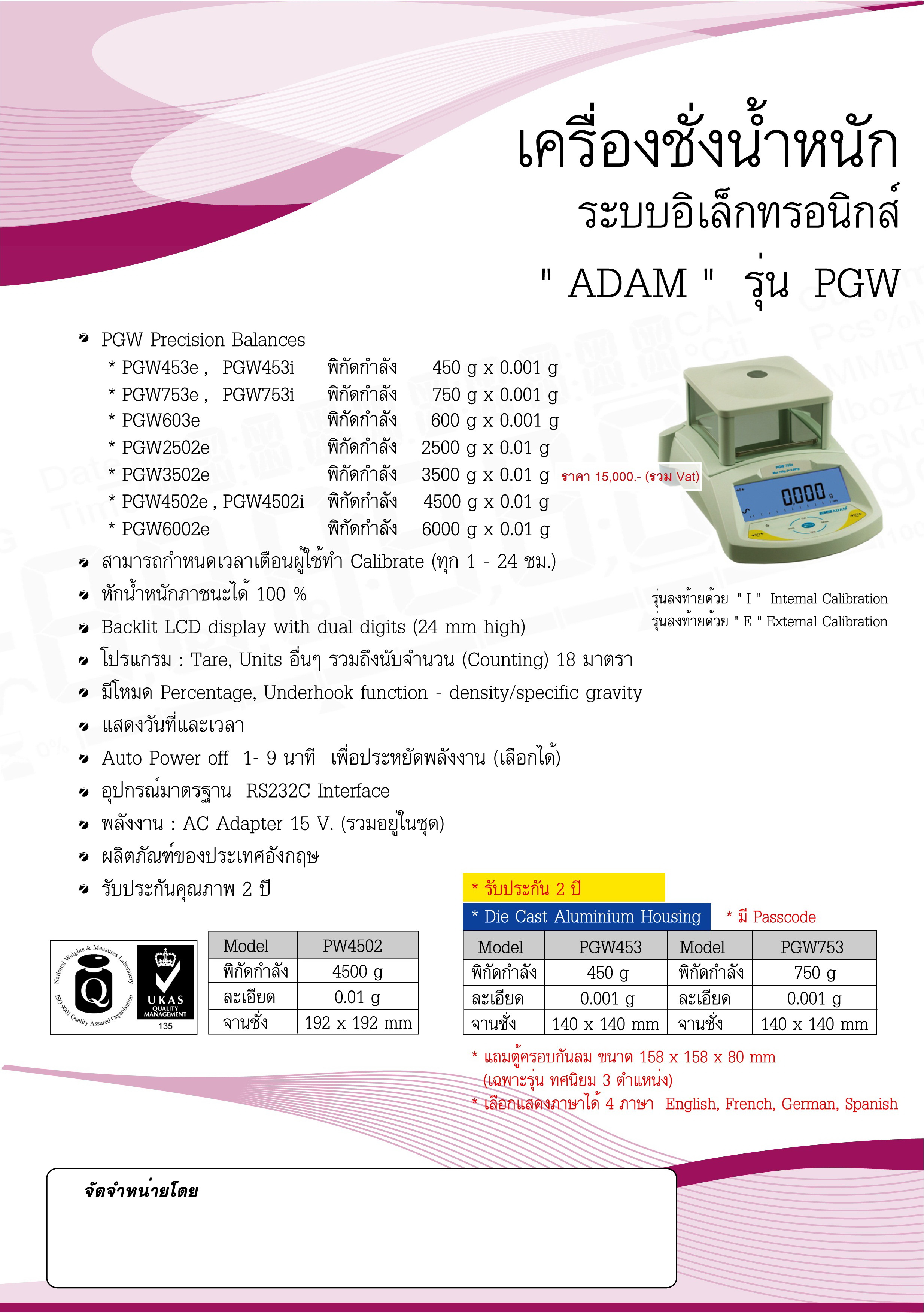 PGL Series Precision Balance /เครื่องชั่งน้ำหนักความละเอียดสูงBrand : ADAM (MADE IN UK)Code :PGL203,PGL2002,PGL8001 Model Capacity Resolution Pan Size PGL203 200g 0.001g 1...