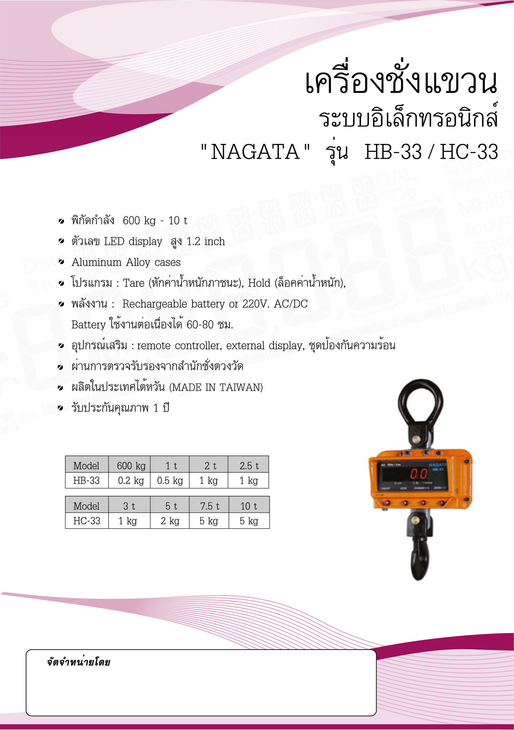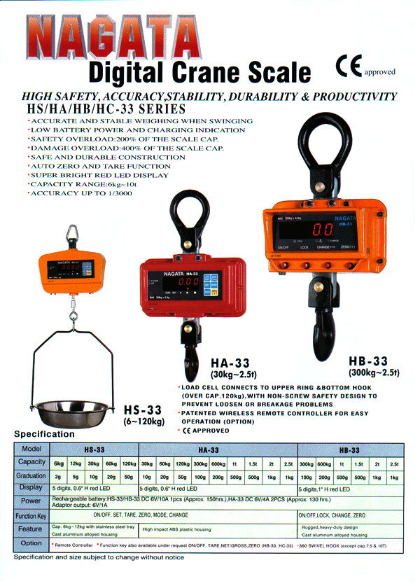HB-33 Series Electronic Crane Scaleเครื่องชั่งแขวน ระบบดิจิตอล Brand : NAGATA (Made in Taiwan) Code : HB-33-600K, HB-33-1T, HB-33-2T, HB-33-2.5T Model Capacity Resolution ...