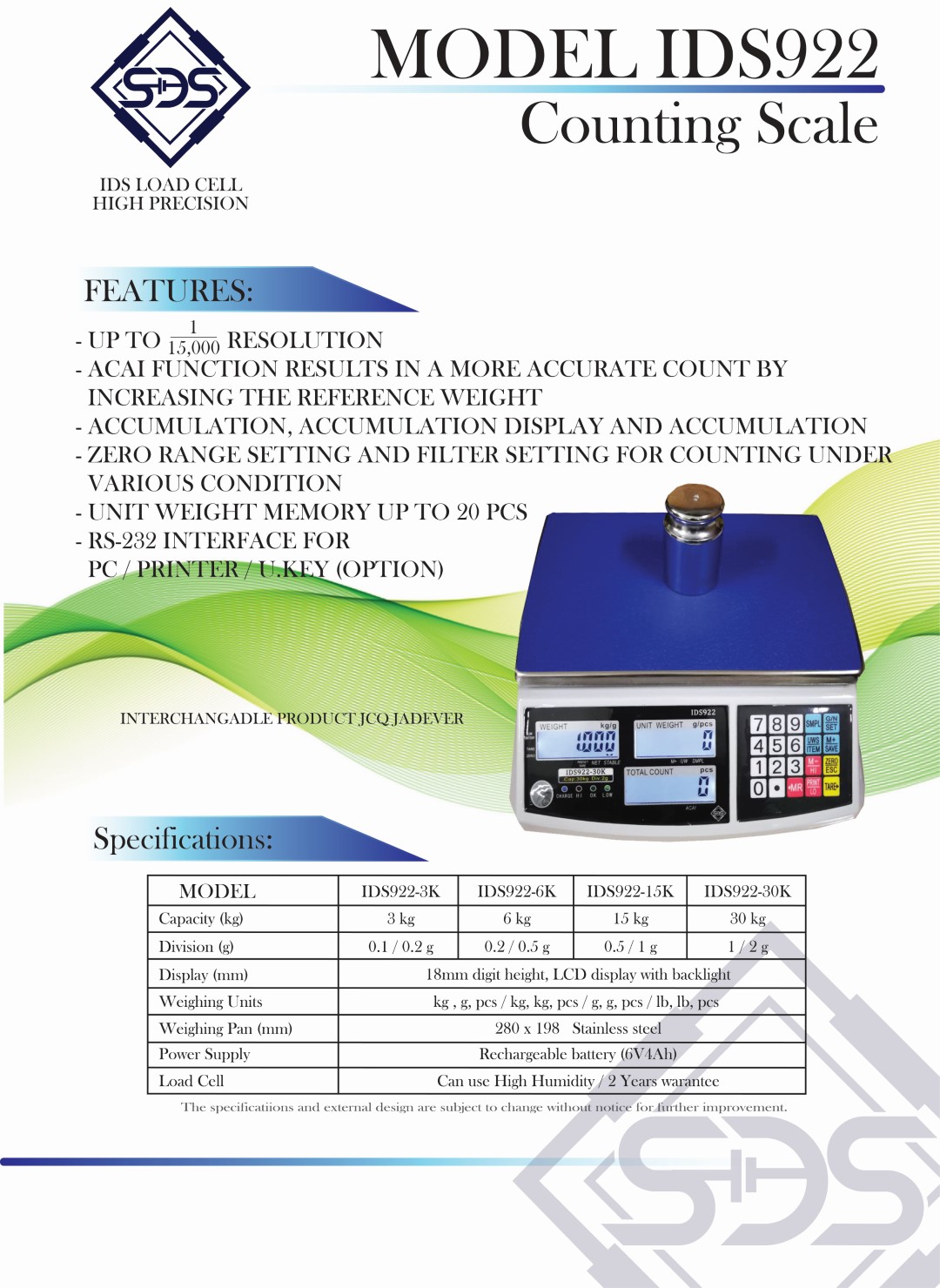 IDS811 Series Counting Scales / เครื่องชั่งนับจำนวน Brand : SDS (MADE IN TAIWAN) Code : IDS811-1.5K, IDS811-3K, IDS811-6K, IDS811-15K, IDS811-30K Model Capacity Pan Size ...