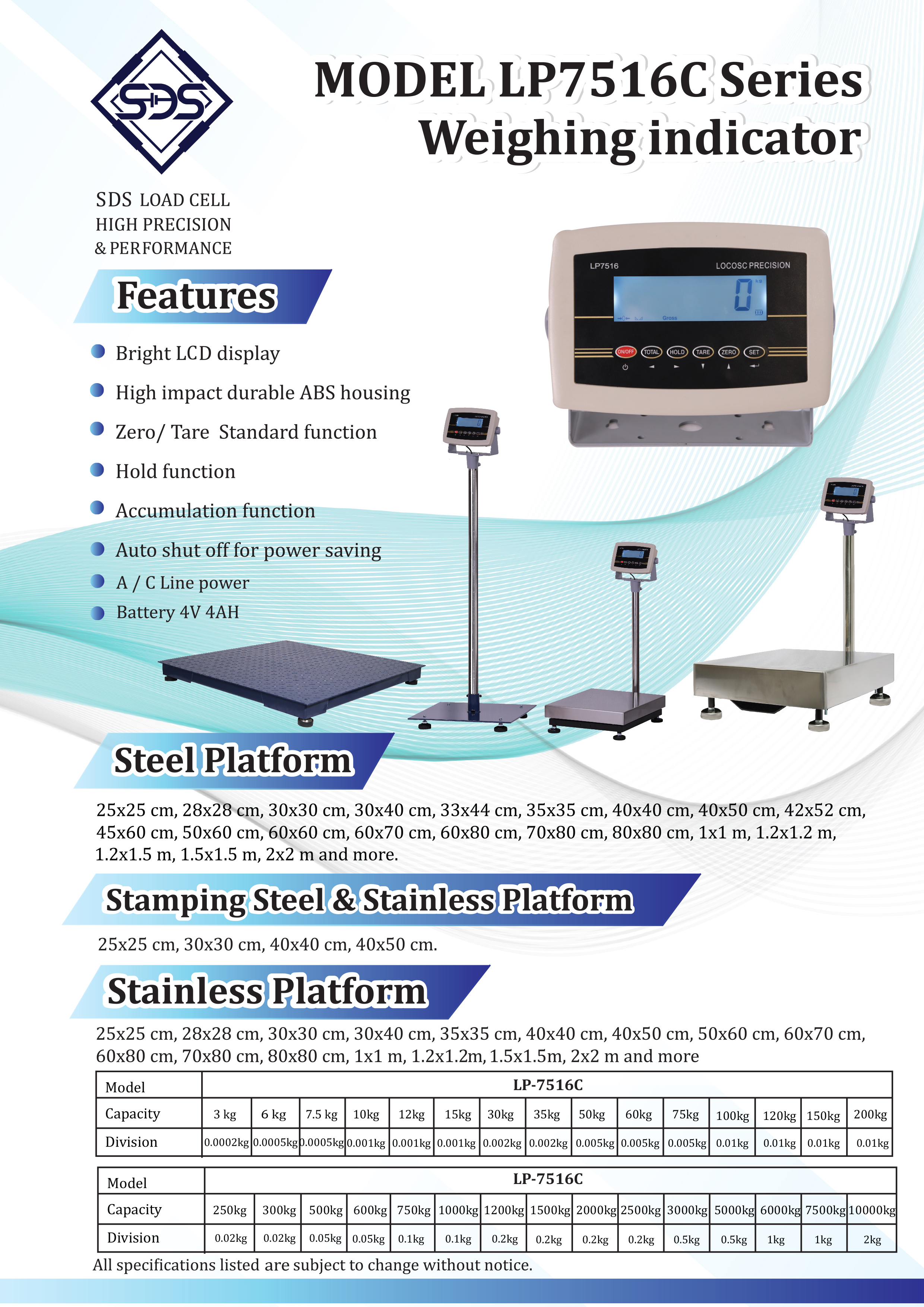 เครื่องชั่ง รุ่น LP7516C เหมาะสำหรับทุกอุตสาหกรรม มีฟังก์ชั่นสำหรับชั่งสิ่งมีชิวิต สำหรับชั่งบ่อเลี้ยงปลา บ่อกุ้ง ชั่งน้ำหนักวัว สุนัข , อีกทั้งยังนิยมใช้ในอุตสาหกรรมขายของเก่า และโรงงานอุตสาหกรรมอีกด้วย มีช่องต่อ RS-232 ในตัวสามารถต่อคอมพิวเตอร์ หรือปริ้นเตอร์ได้ มั่นใจได้ตลอดอายุการใช้งาน มีอะไหล่ และ ศูนย์บริการในไทย